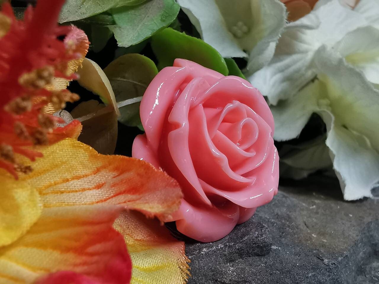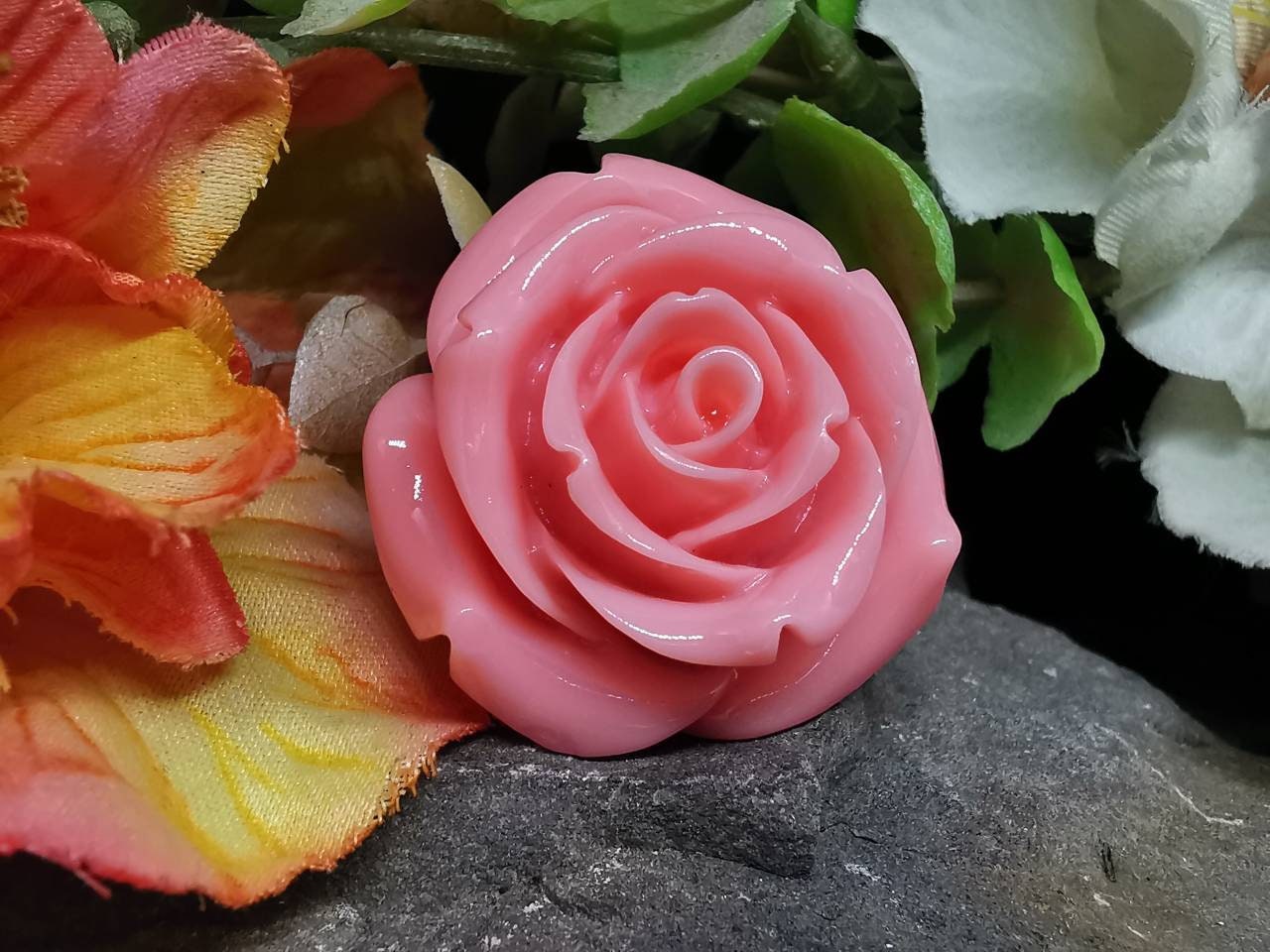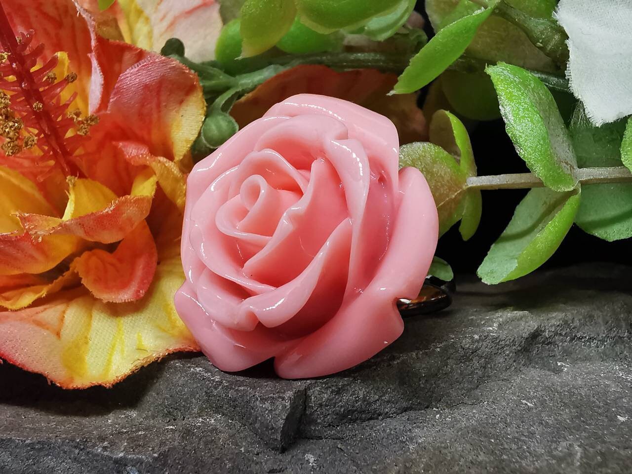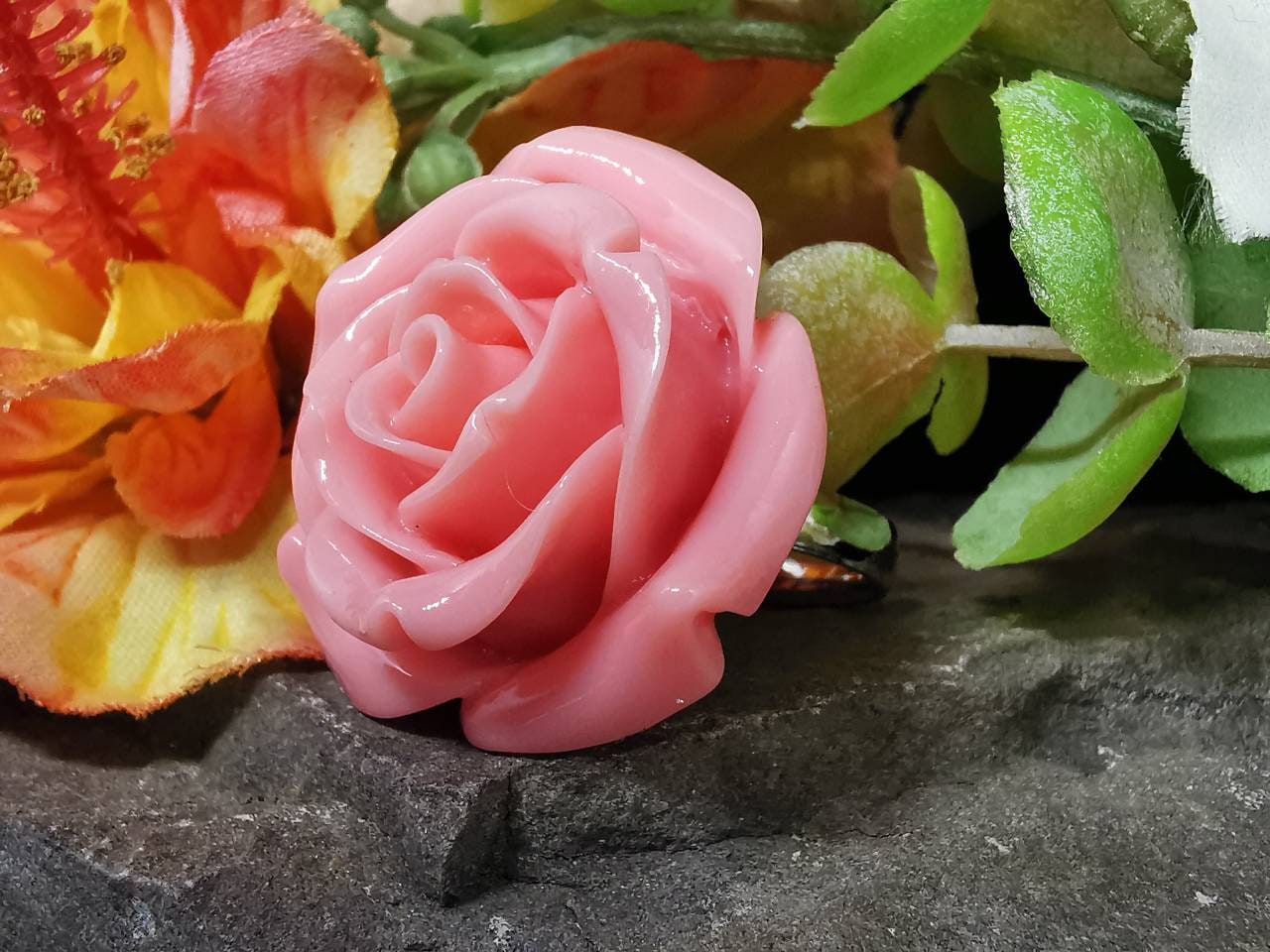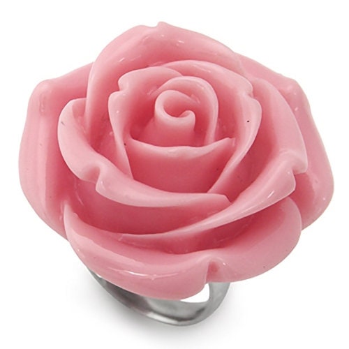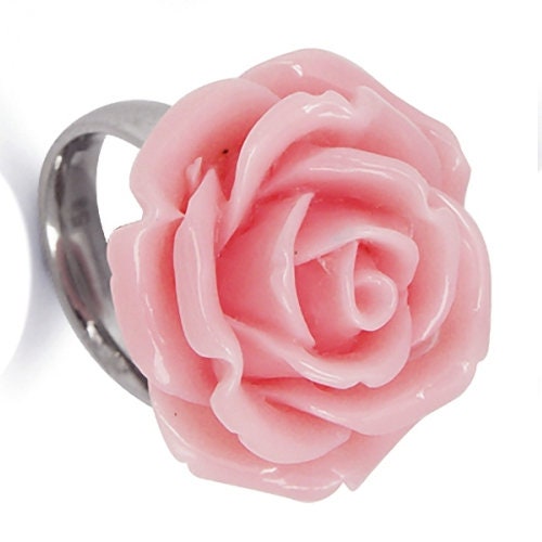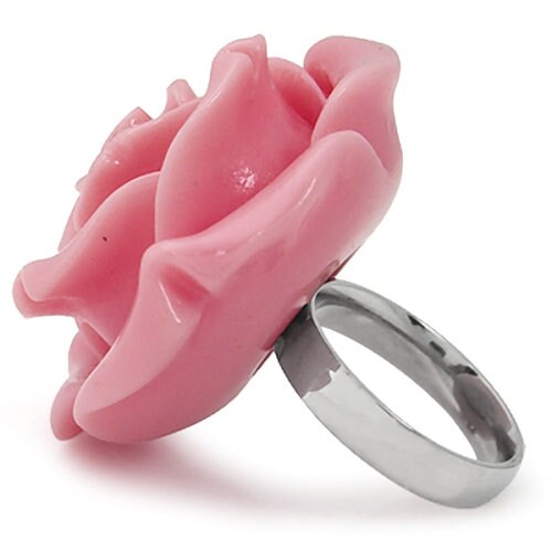 WOW! These rings are absolute and utter show stoppers. They are beautiful roses, in various colours, made from plastic and set upon a stainless steel band.