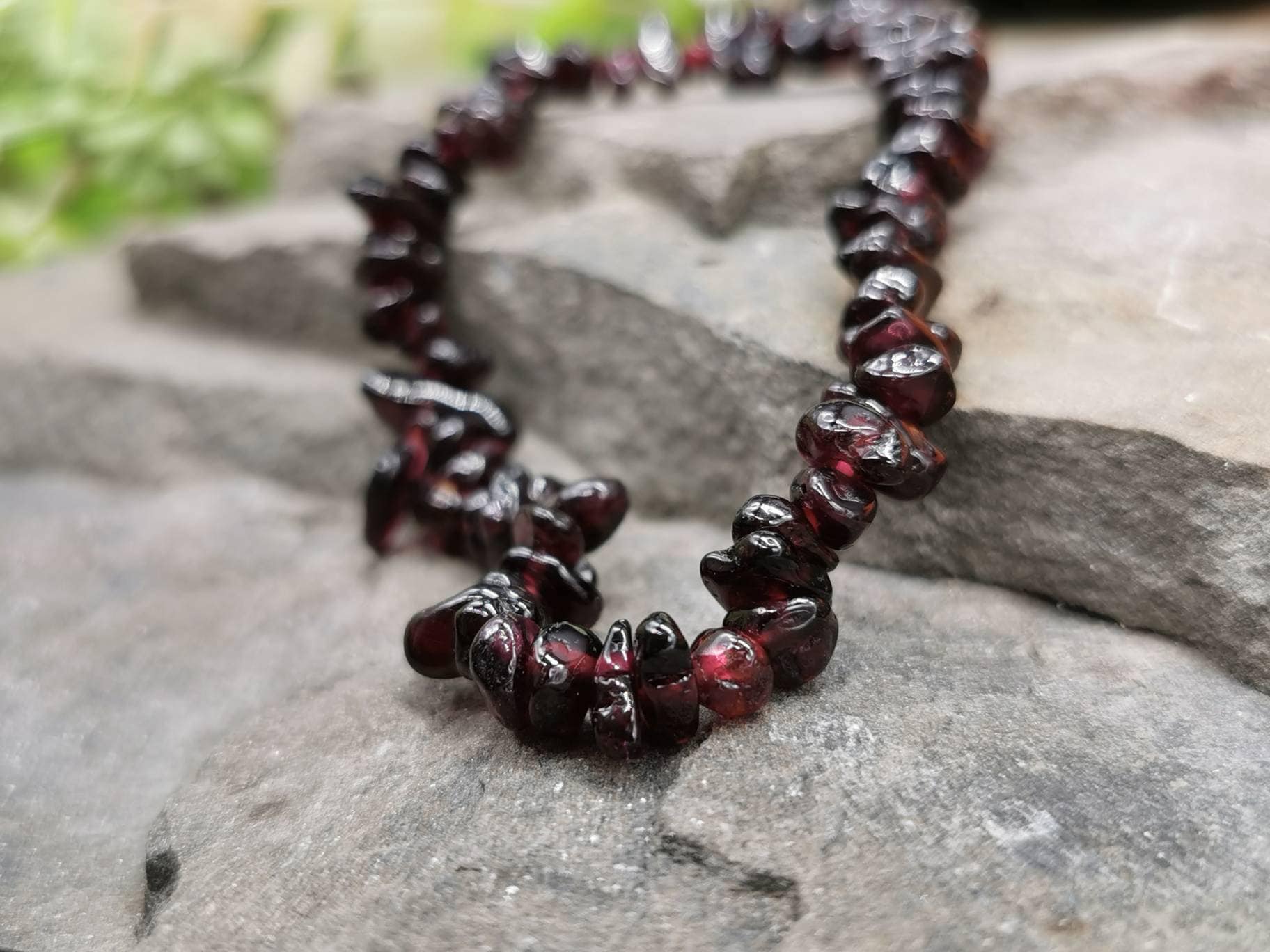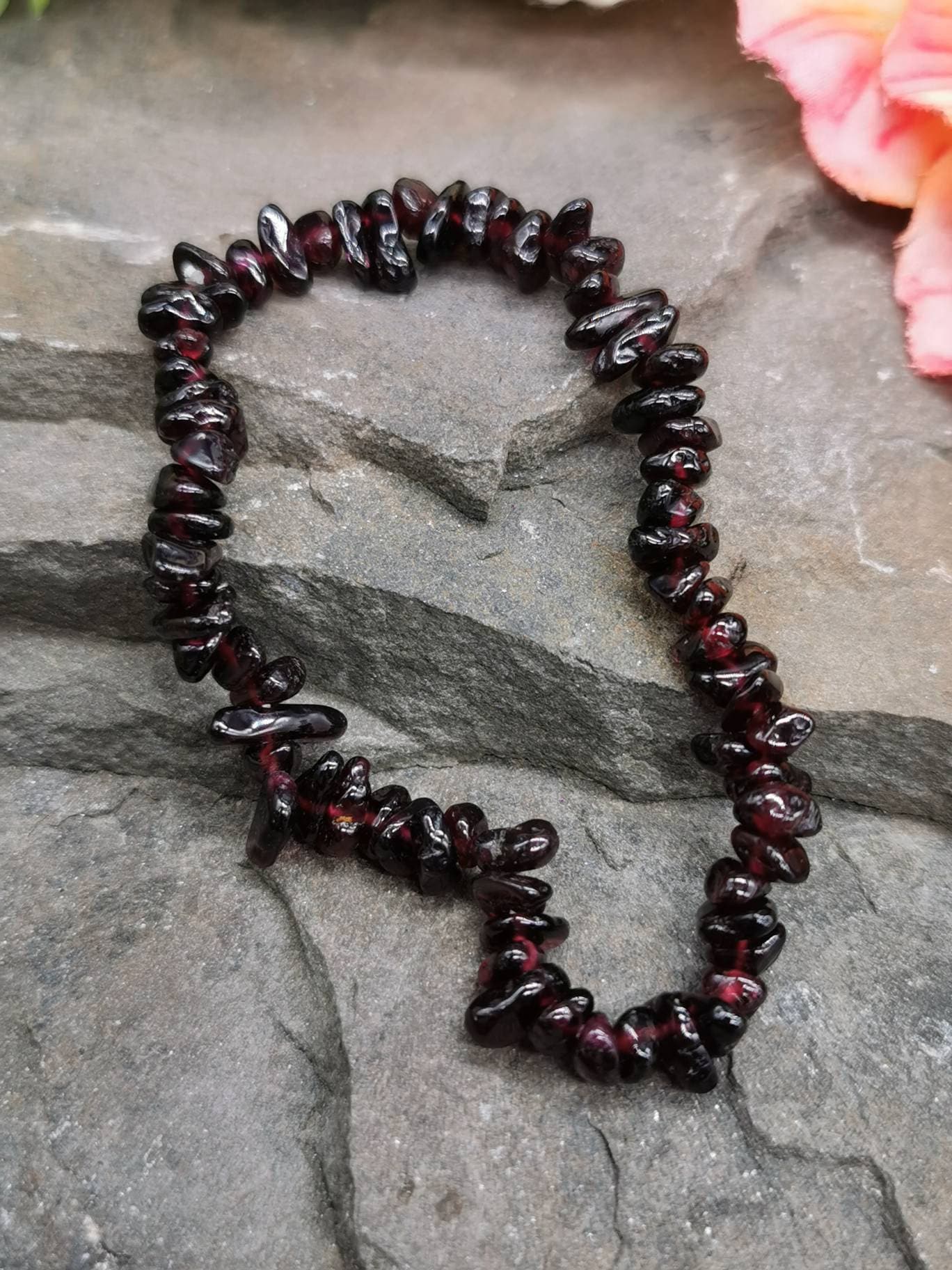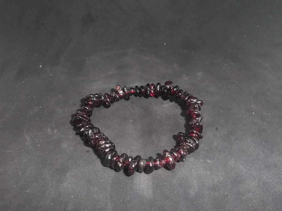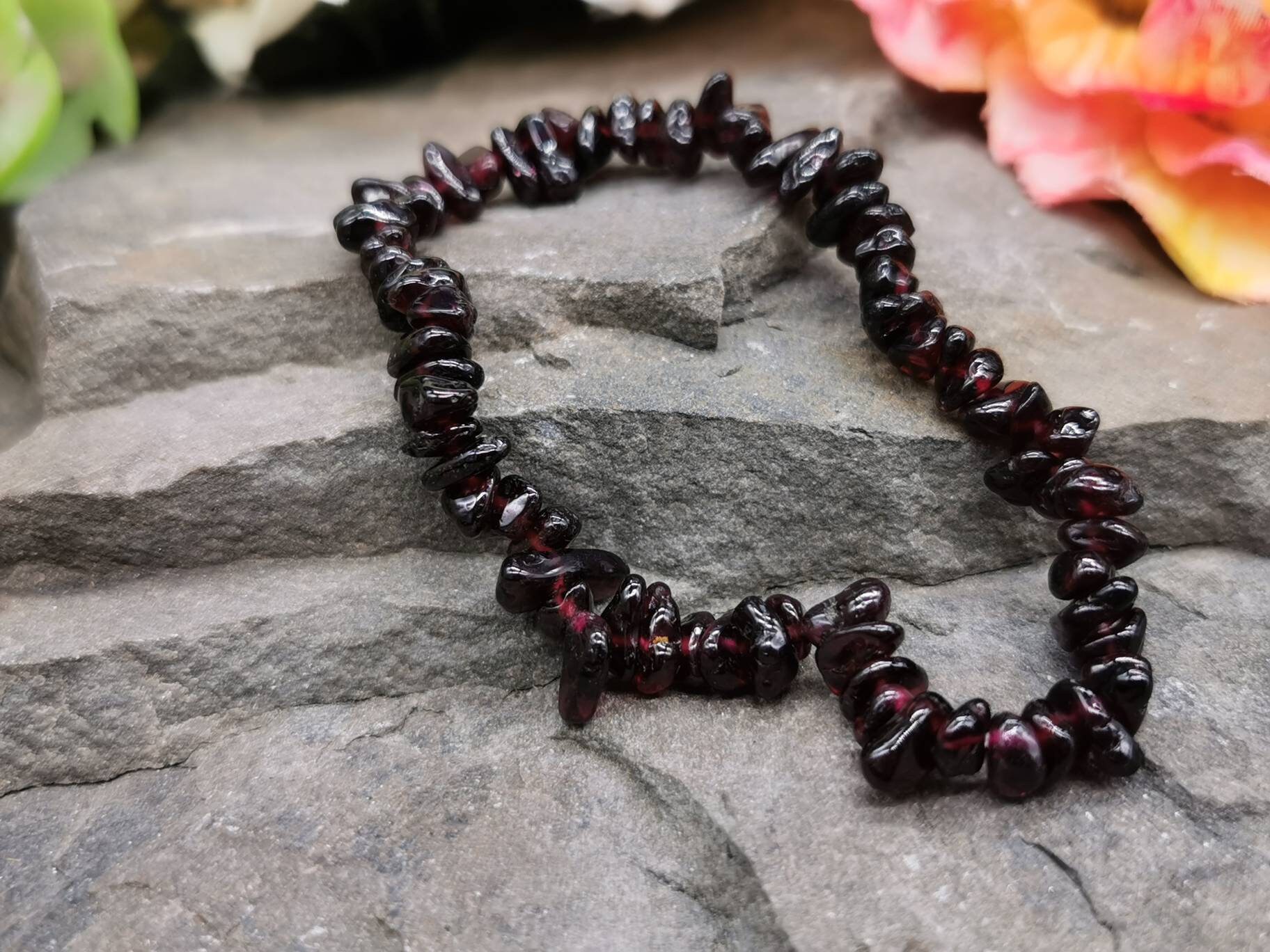 Each bracelet is handmade from chips of Garnet, and small differences may occur as a result. Each chip measures up to 1cm across, and all are irregularly shaped.