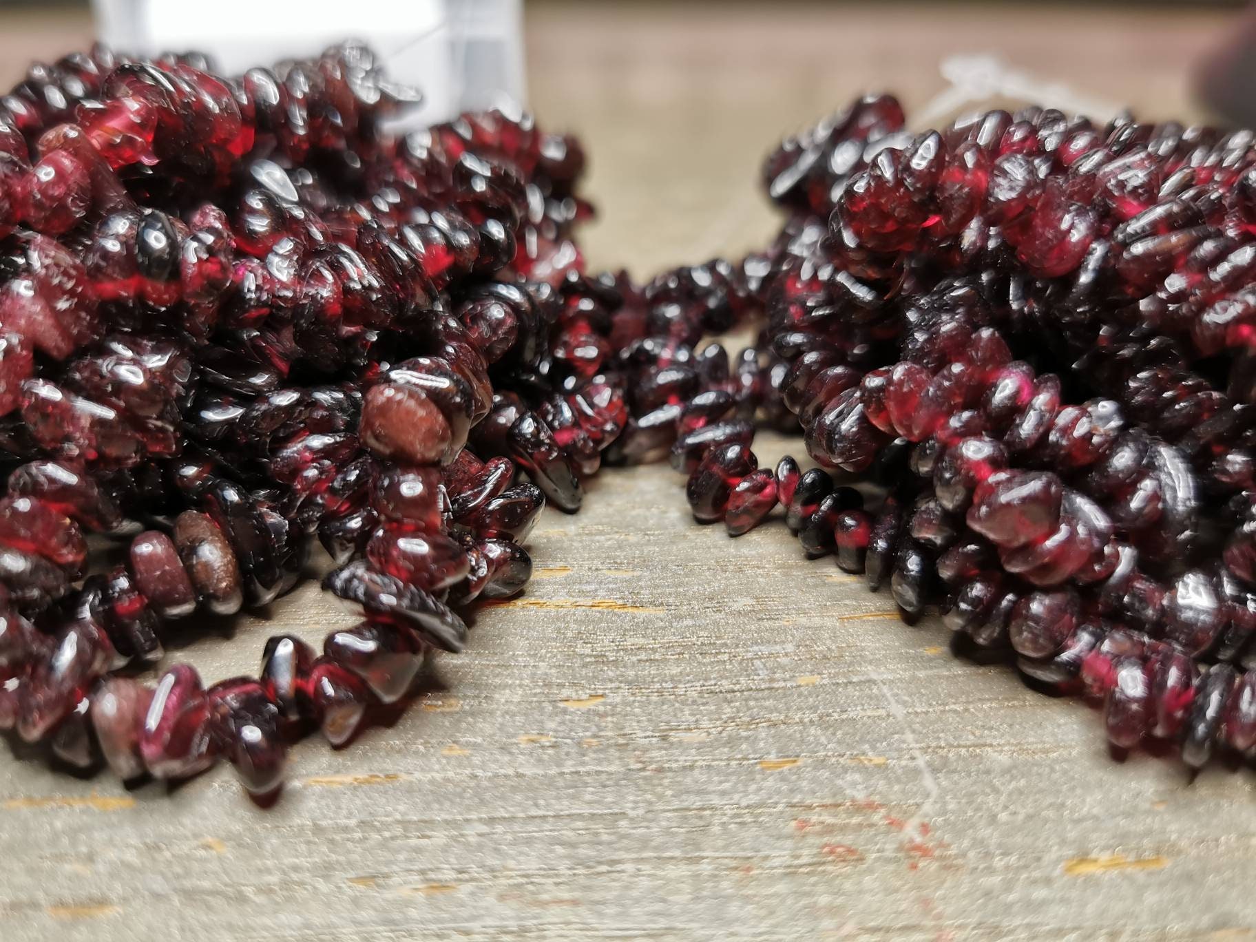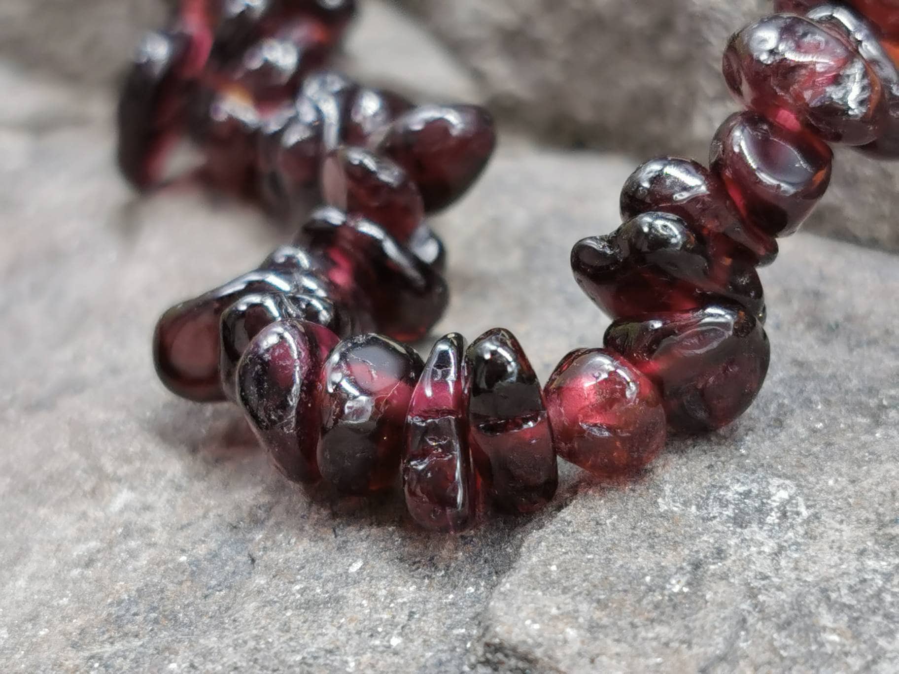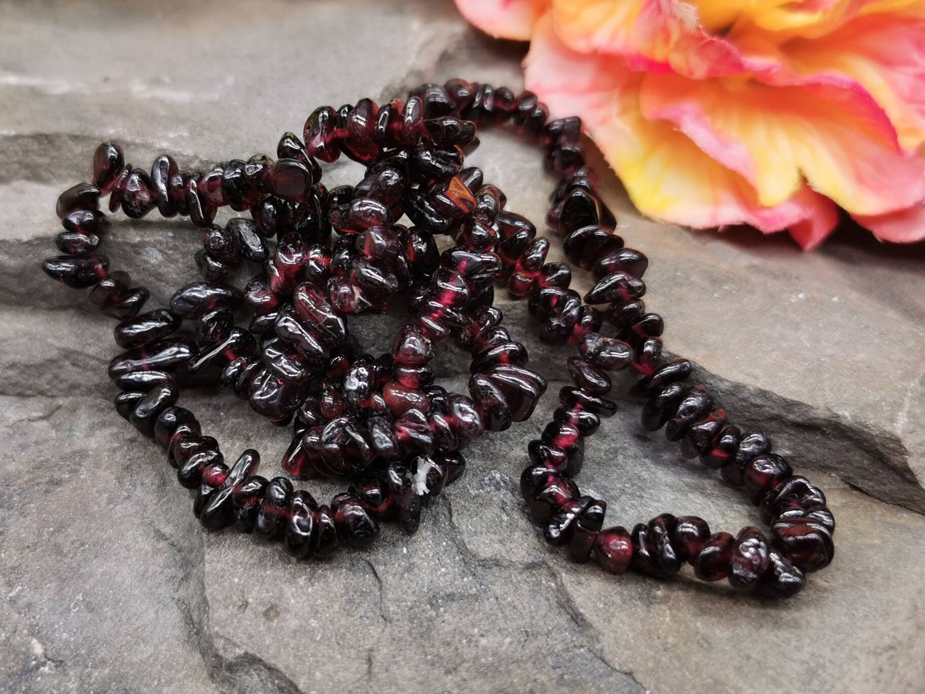 Each bracelet is handmade from chips of Garnet, and small differences may occur as a result. Each chip measures up to 1cm across, and all are irregularly shaped.