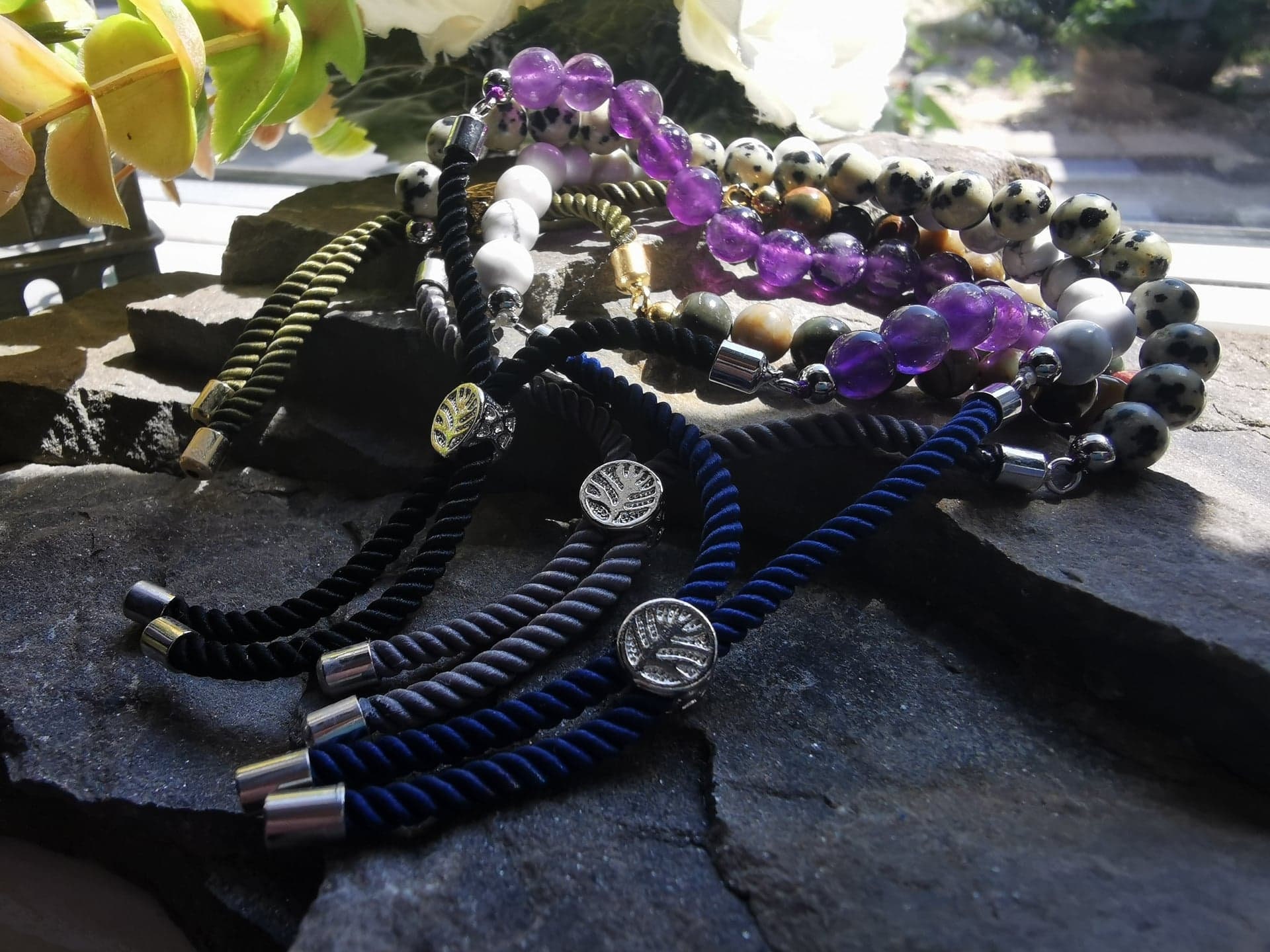 Each bracelet is handmade from 6mm round beads of White Howlite, threaded on to a navy cord/string. At the end of the 14cm length of White Howlite Beads there are two small silver plated beads. From these beads there is a navy cord which is tipped with silver plated finishings. The whole bracelet measures approximately 30cm long. In order to adjust the bracelet to fit your wrist, there is a gorgeous little Tree of Life bead which slides up the cord, which is also silver plated. All bracelets are handcrafted using genuine semi-precious gemstones and provide many health benefits. Plus, they look great on, and compliment all styles and outfits. They look great stacked together, or with my chipped gemstone bracelets.